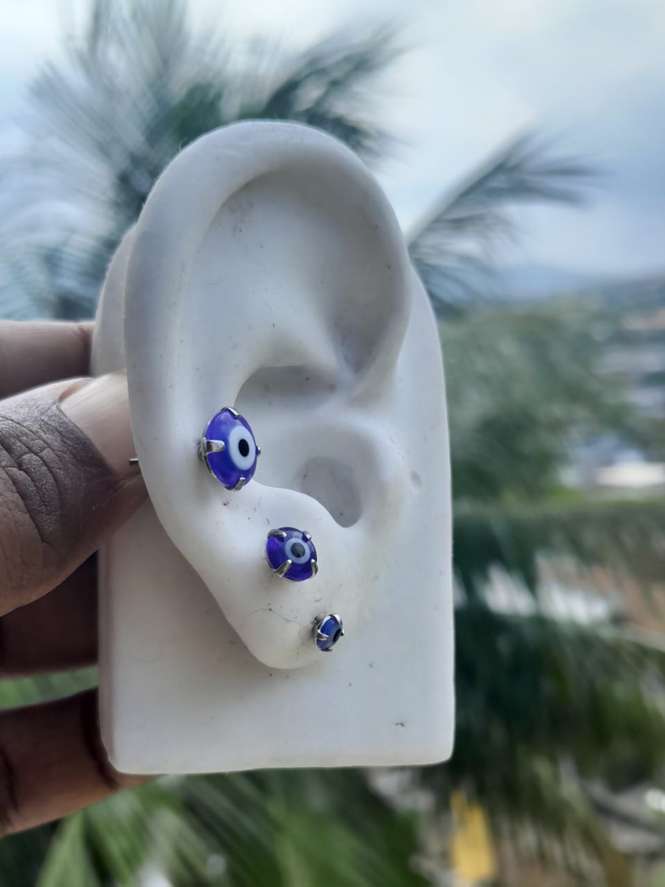 Cartela Brinco Trio Olho Grego Aço Inoxidável Hipoalérgico. Azul Escuro